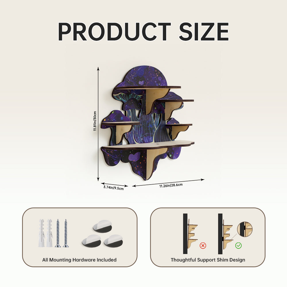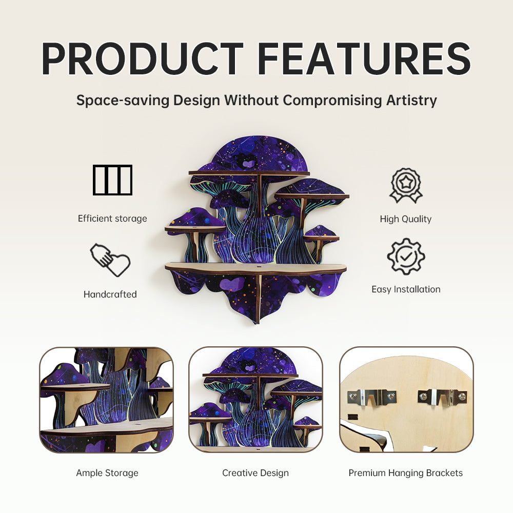 - Unique Design Inspired by Customer Favorites: Introducing our Mushroom Shelf, meticulously adorned with whimsical snails, moons, stars, and floral motifs. The surface of the wood is intricately engraved with these delightful patterns, creating a harmonious and enchanting visual appeal. This design was inspired by our customers' love for these natural and whimsical elements, bringing together their favorite imagery in one exquisite piece.